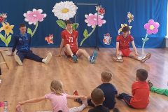 Brały udział w warsztatach sportowych prowadzonych przez uczniów LIX Liceum Ogólnokształcące Mistrzostwa Sportowego im. Janusza Kusocińskiego w Warszawie i jednocześnie zawodników Klubu Sportowego „Metro” Warszawa” oraz sędziego Mazowieckiego Związku Piłki Siatkowej. Dzieci obejrzały ( i przymierzały) strój siatkarza, dowiedziały się najważniejszych rzeczy o pracy siatkarza i sędziego. Poznały podstawowe zasady gry w siatkówkę, uczestniczyły w rozgrzewce, ćwiczyły podstawowe sposoby odbijania piłki oraz kibicowały zawodnikom podczas rozegranemu setowi siatkówki. Na koniec wszystkie dzieci z pucharami i medali zdobytymi przez naszych gości pozowały do pamiątkowego zdjęcia.