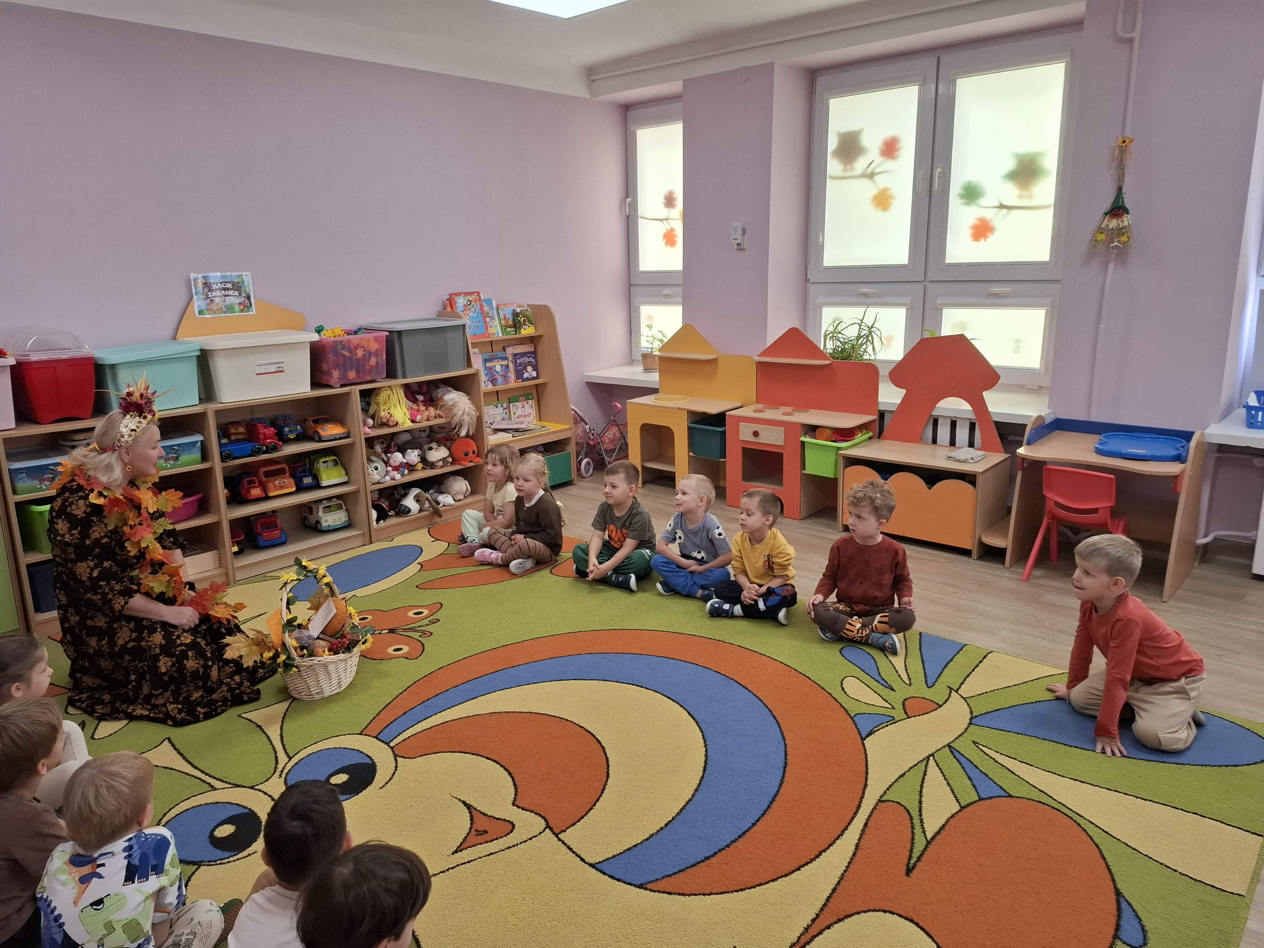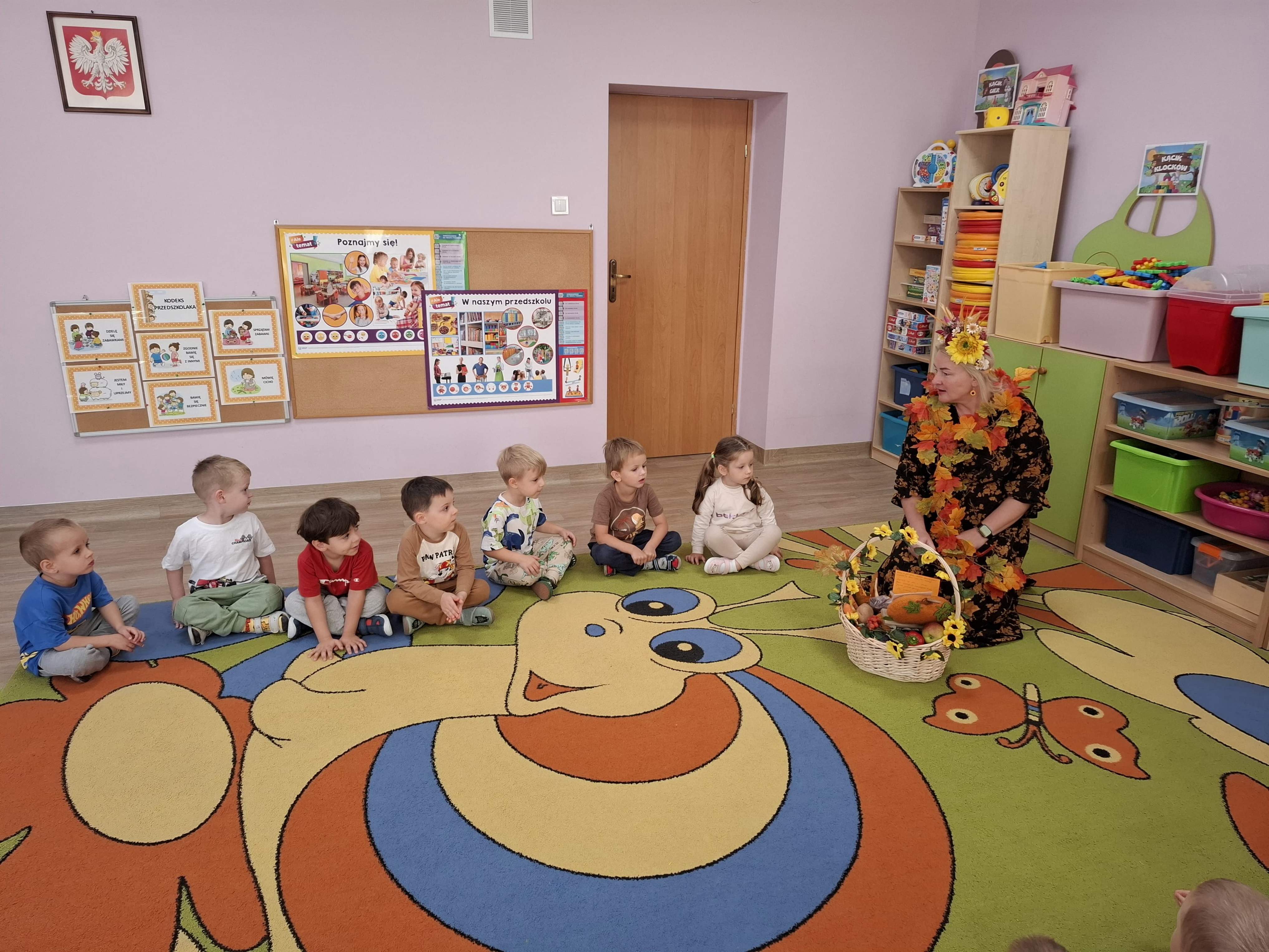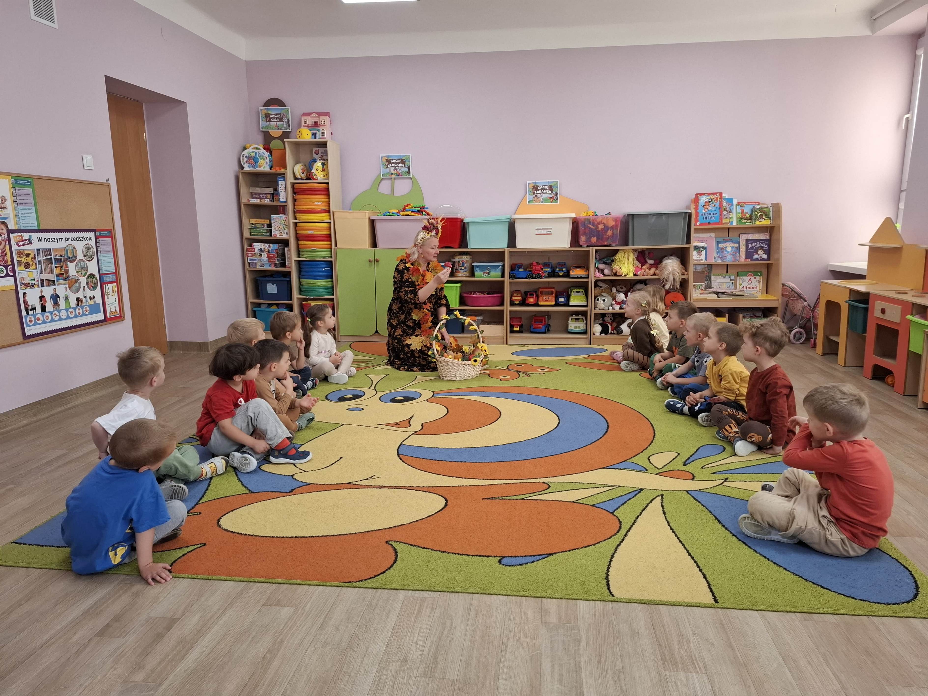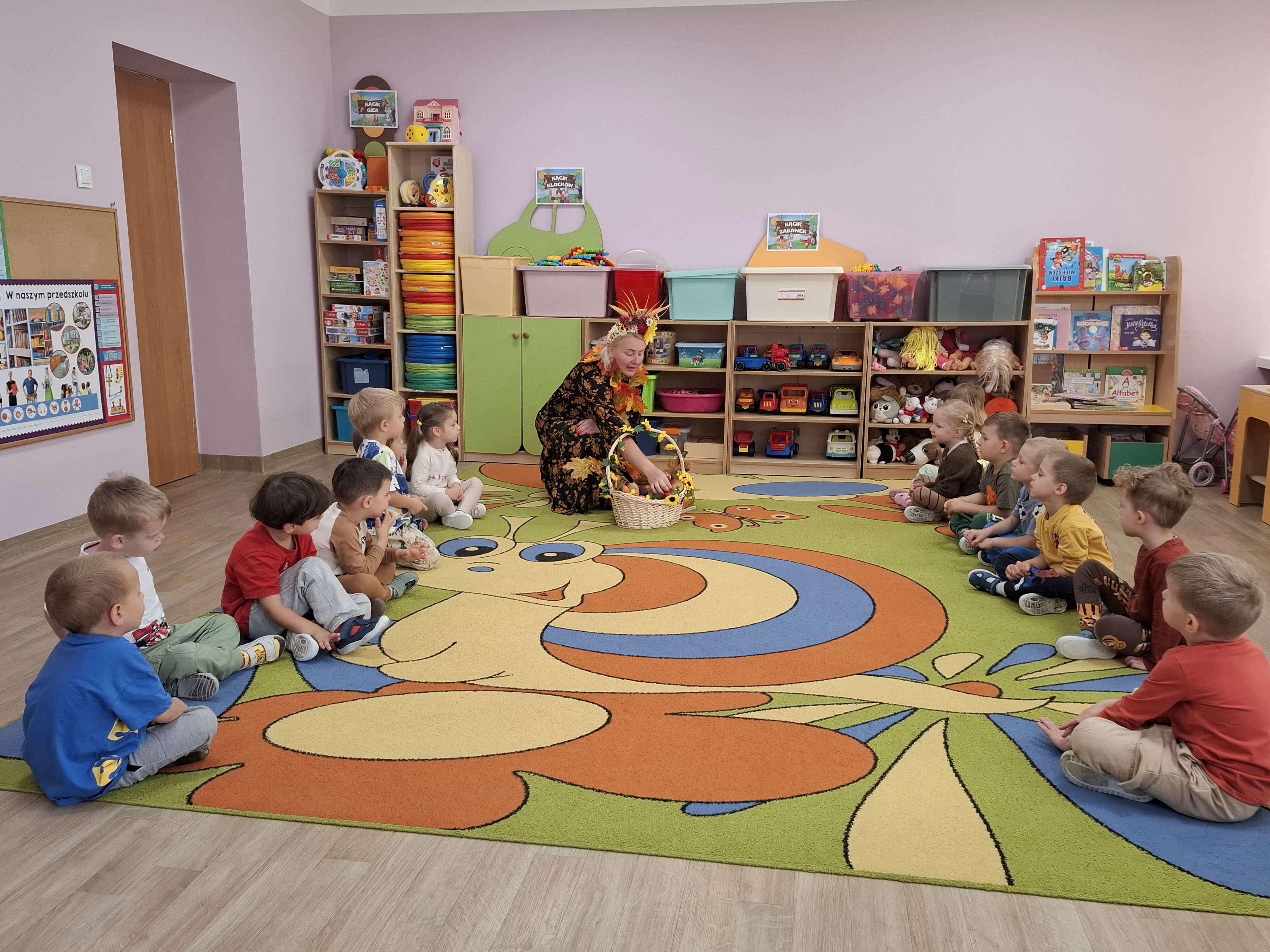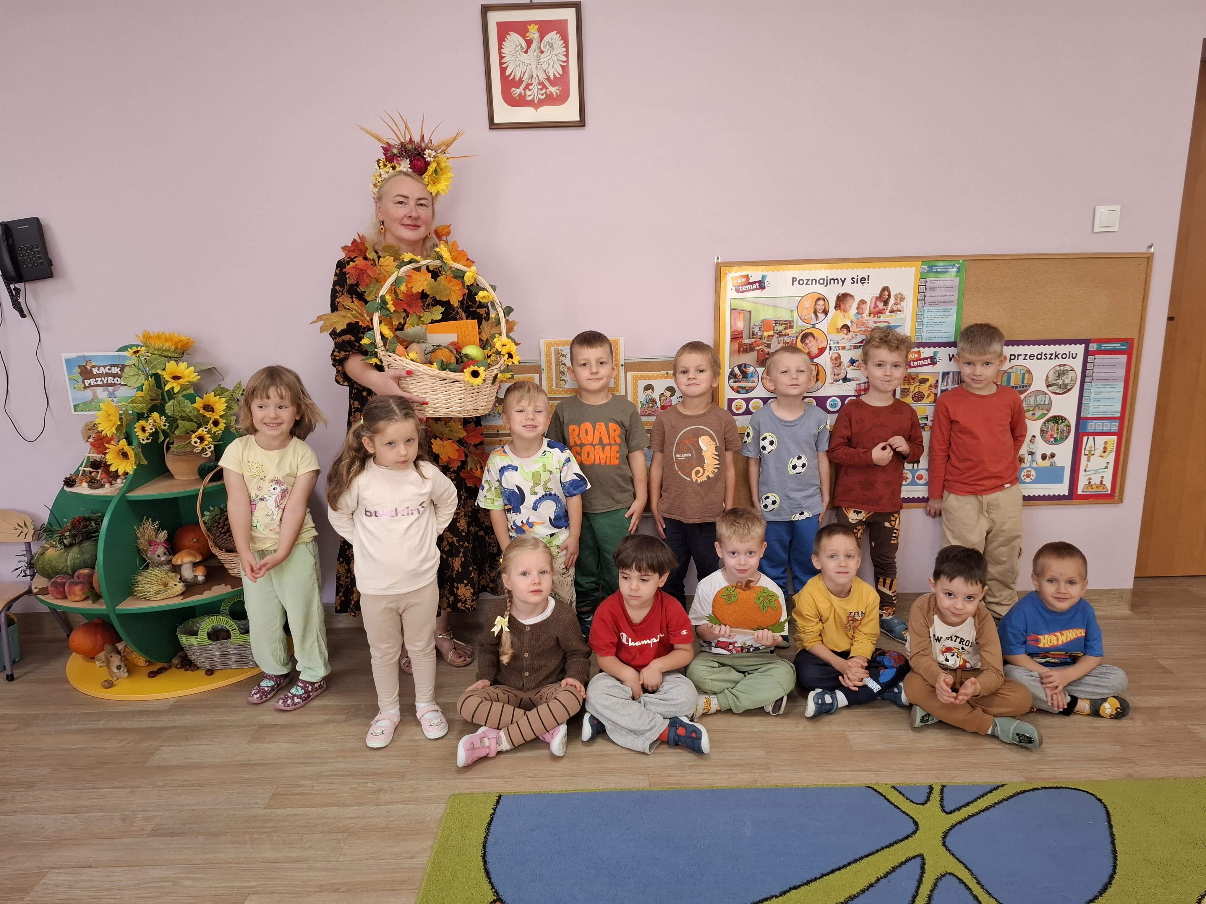 Po śniadaniu wszystkie grupy przedszkolaków odwiedził gość specjalny – PANI JESIEŃ – przynosząc ze sobą kosz z jesiennymi darami oraz upominek do kącika przyrodniczego. Zaprosiła dzieci do świętowania oraz zabawy. Tego dnia nie zabrakło jesiennych zagadek oraz zabaw ruchowych np. ,,Dary Pani Jesieni”. Dzieci wzięły również udział w jesiennych konkursach, a także wykonały pracę plastyczną – ,,Drzewo jesienne”.