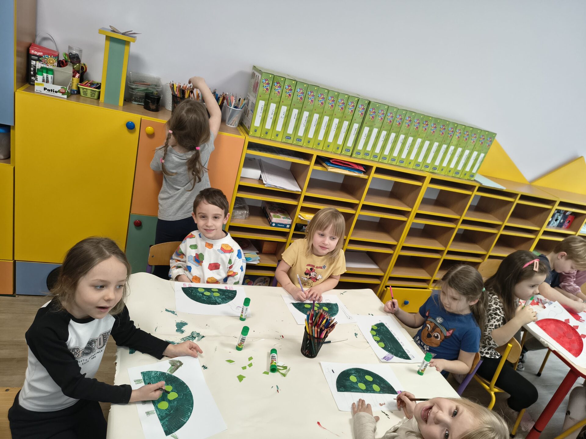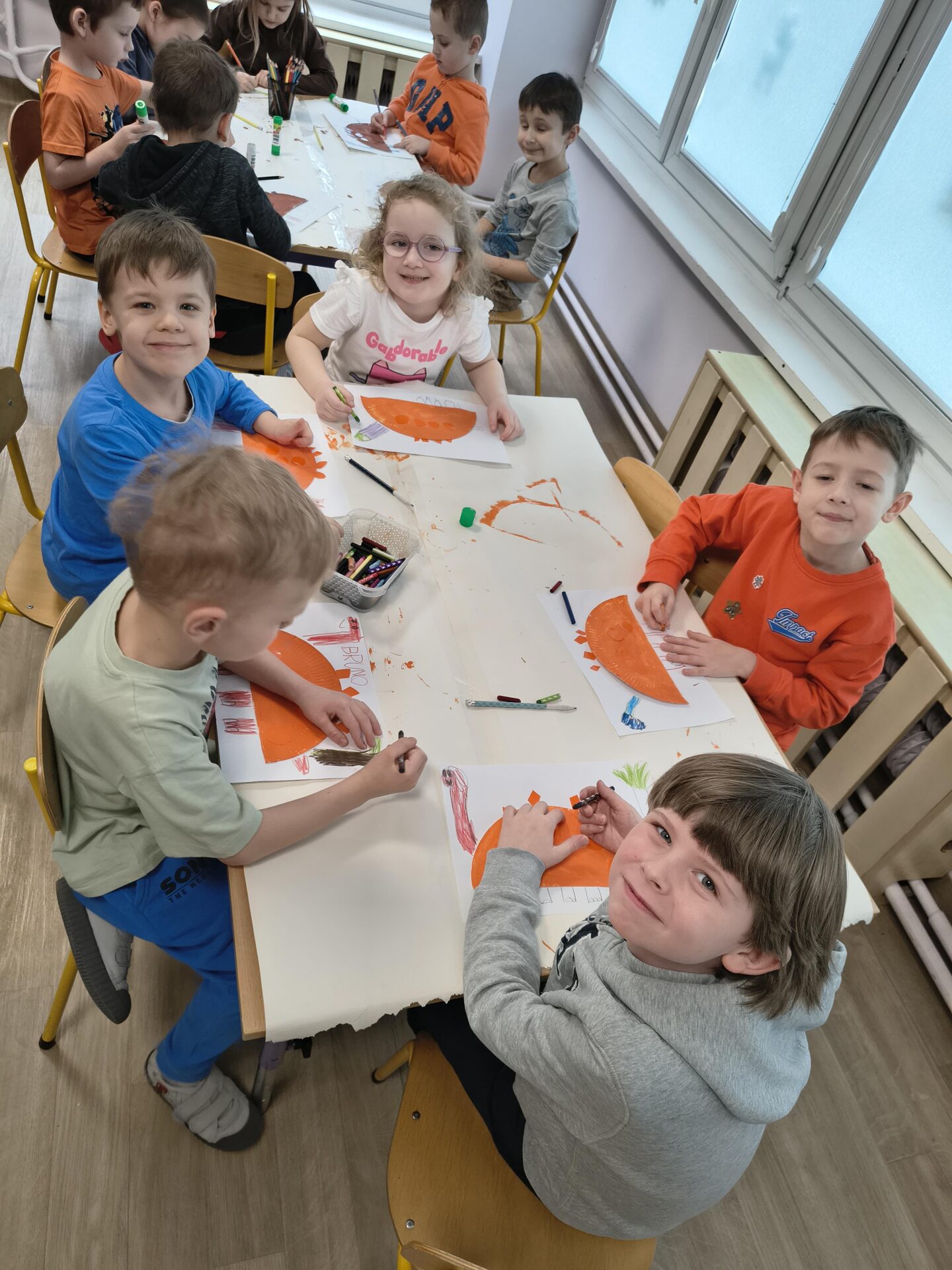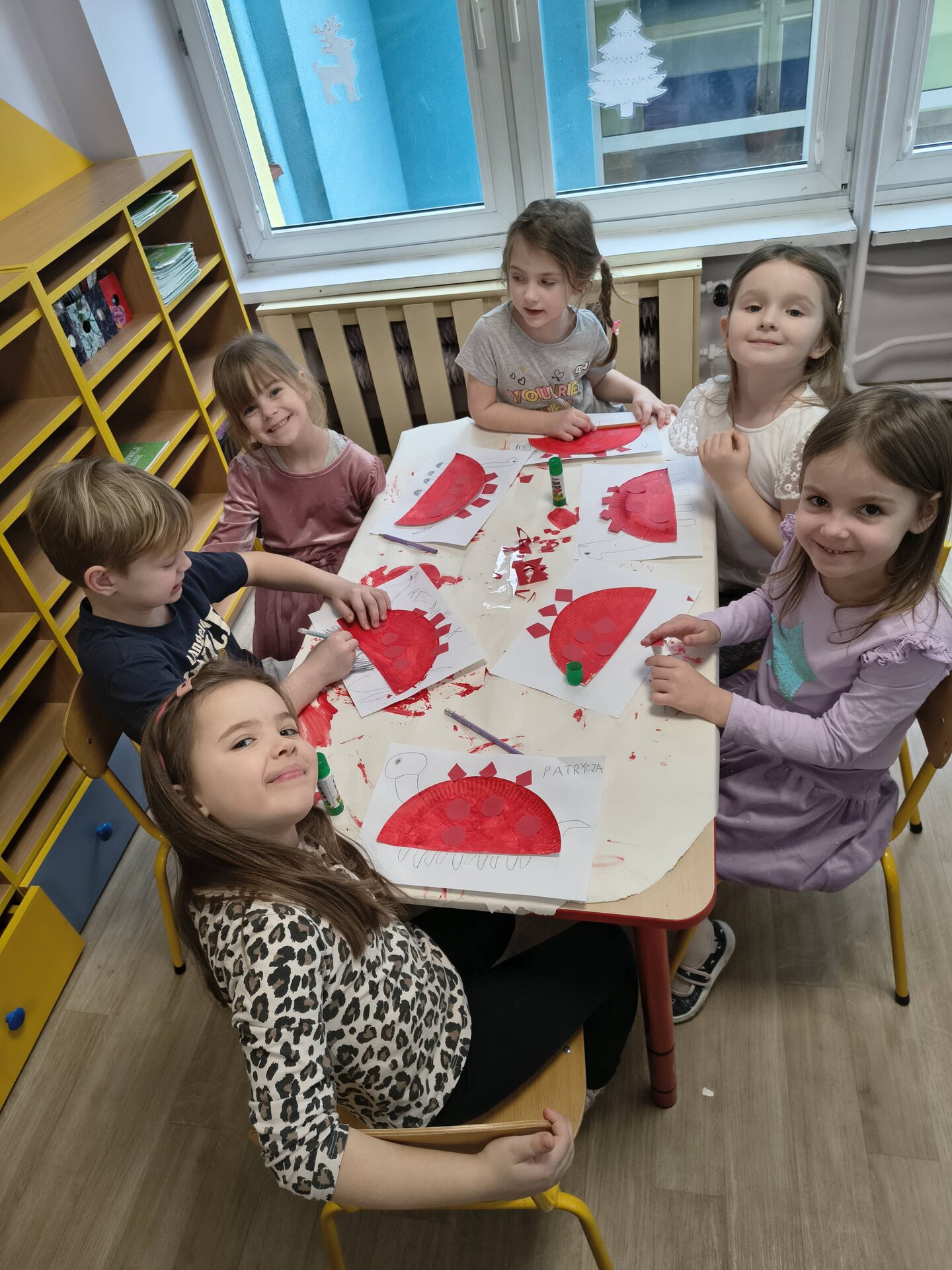 Podczas różnorodnych aktywności stworzyliśmy dzieciom świetną okazję do odkrywania i zgłębiania tajemnic prehistorycznego świata, a w szczególności dinozaurów, które fascynują nie tylko naszych milusińskich. Dzieci poprzez zabawę poznały zwyczaje i zachowania tych prehistorycznych gadów, dowiedziały się dlaczego dinozaury wyginęły, pobawiły się w paleontologów i stworzyły szkielet dinozaura, naśladowały sposób poruszania się tych zwierząt, przeliczały, badały, odkrywały zawartość dinozaurowych jaj i brzuchów, słuchały piosenek o dinozaurach. W każdej grupie wiekowej powstały przepiękne galerie prac, w których dzieci odzwierciedliły swoje wyobrażenie mieszkańca jurajskiego świata.